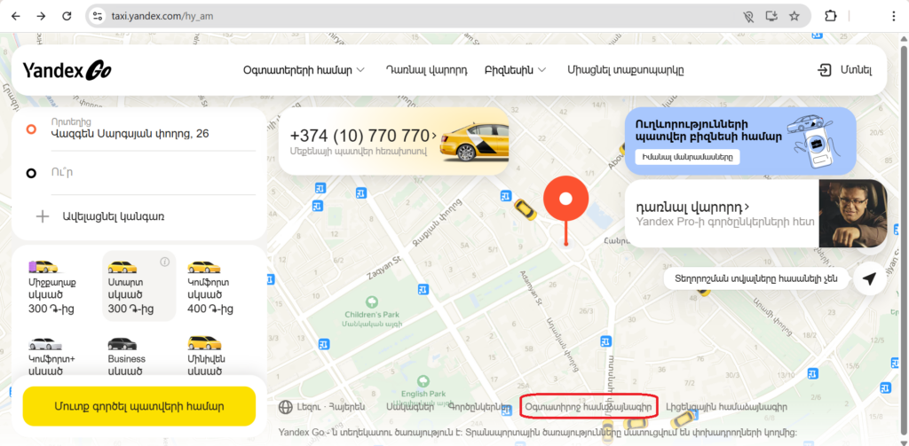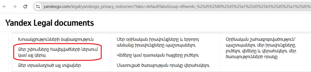 Գաղտնիության ծանուցագրին հասնելու համար նախ անհրաժեշտ է ընդհանուր էջի ներքեւի հատվածում անցնել «Օգտատիրոջ համաձայնագիր» բաժինը (տես՝ Նկար 2-ում կարմիրով ընդգծված հատվածը), բացել Պայմանները հայերեն, անցնել Պայմաններում տվյալների մշակման համաձայնությանը վերաբերող 2.11 կետում ներկայացված https://yandexgo.com/legal/yandexgo_privacy_notice/en/ հղմամբ եւ այդտեղ բացել Գաղտնիության ծանուցագիրը հայերեն: