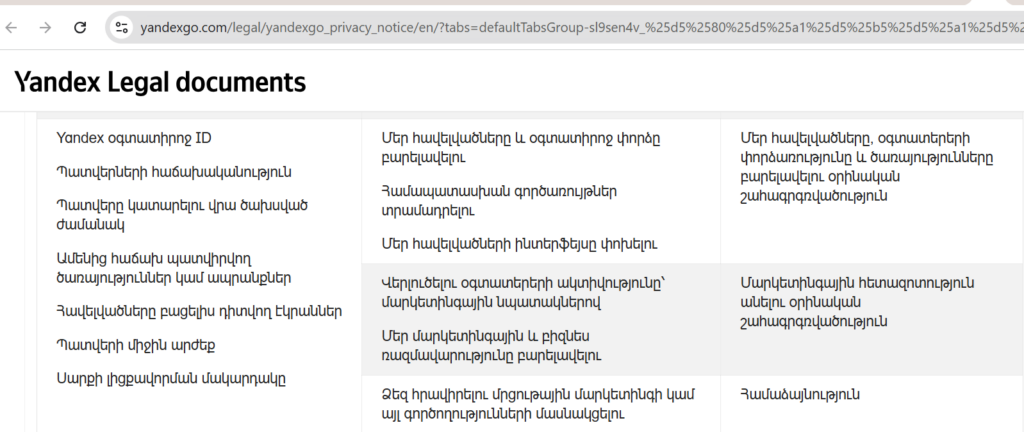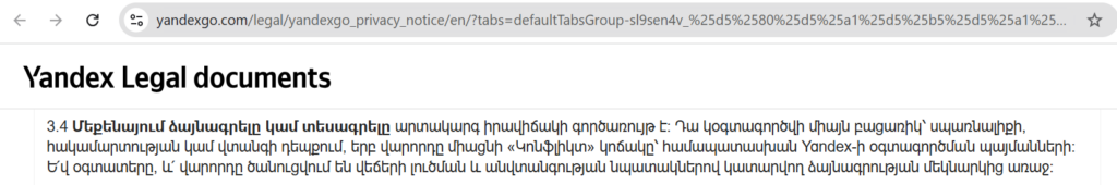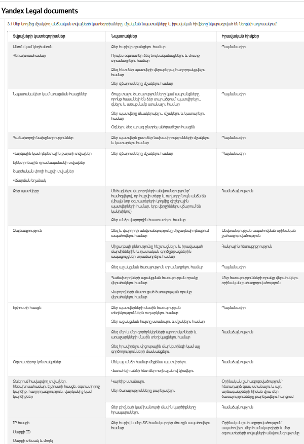 «Yandex Armenia»-ն իր օգտատերերի տվյալների մշակման համաձայնությունը ստանում է երկու փաստաթղթի միջոցով՝